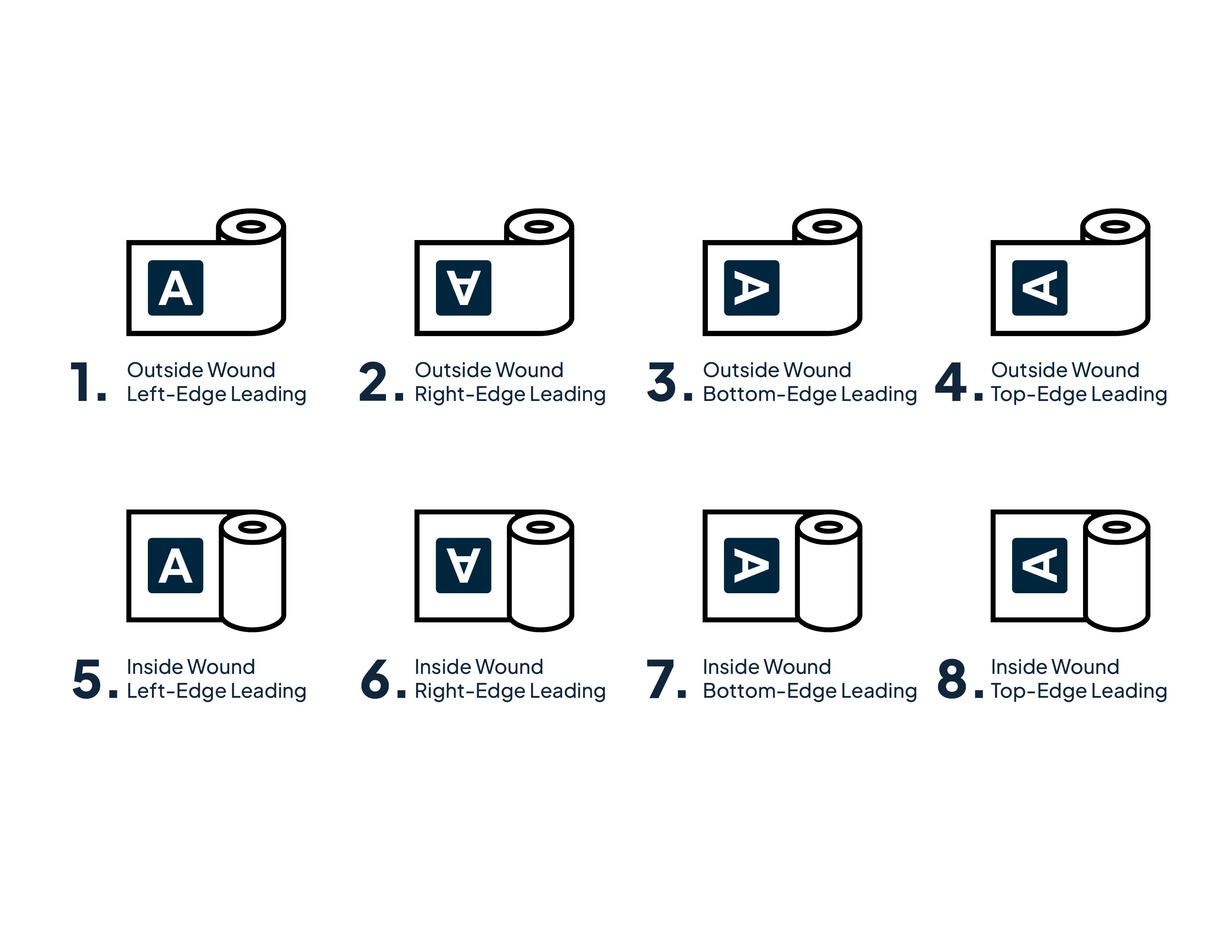 For the machine finishing of your labels it is important that you know which winding direction you need for your machine. A distinction is made between inner and outer winding and how your labels are positioned on the roll, i.e. bottom edge leading, top edge leading, left edge leading, right edge leading.